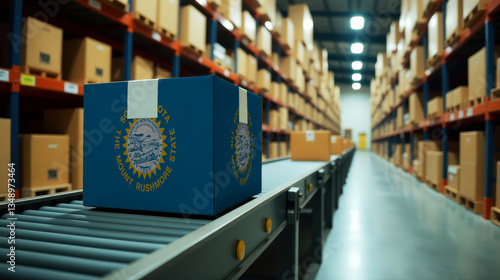 South Dakota parcel on a conveyor in a modern distribution center. Symbolizing trade, global exports, and the efficiency of logistics
