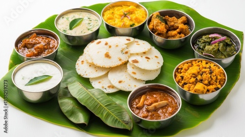 South Indian meal preparation served in metal bowls on a fresh banana leaf for advertising food product