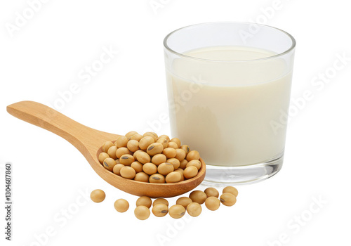 Soy Beans in Wooden Spoon with soy milk in glass isolated on White background