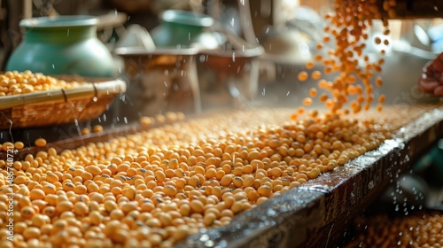 Soybean harvest being loaded into grain truck, golden beans flowing in continuous stream under afternoon sun