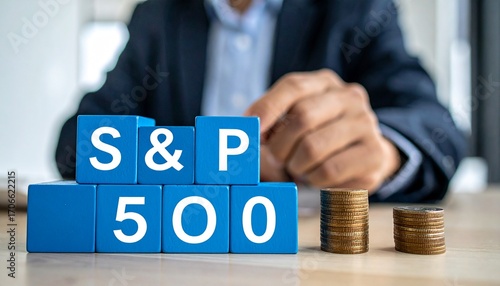 S&P 500 blocks and coins, concept of stock market. An individual in a suit is positioned behind blocks spelling S&P 500, with stacks of coins