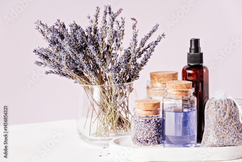 Spa and Wellness Scene Featuring Lavender and Glass Jars. Aromatherapy Setup. Dried lavender flowers in a glass vase with cork-sealed bottles, essential oil, sachet, and amber spray bottle