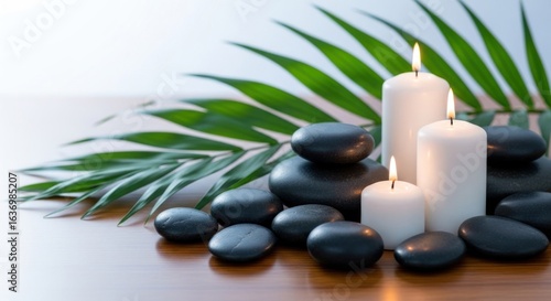 Spa arrangement with palm leaf, candles, and smooth black stones on wood