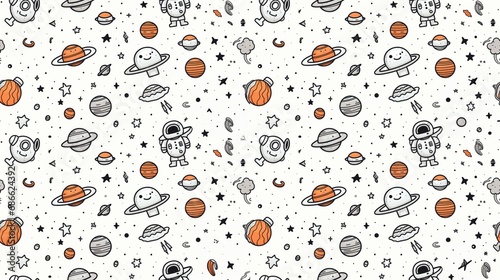 Space background.Seamless pattern with cartoon space planets, stars, astronauts and UFOs on a white background. Children's doodles.