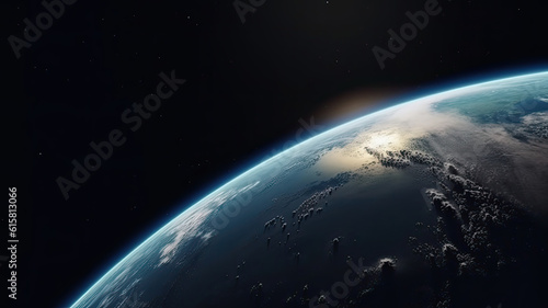 Space planet earth left semicircle shot with blue atmosfera around and light peeking out. Universe science astronomy space dark background wallpaper