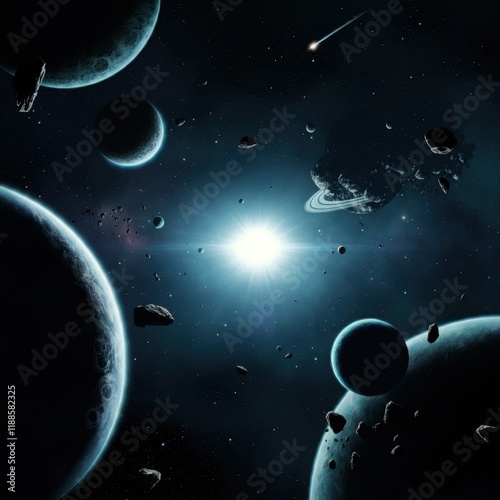 Space scene, multiple planets, celestial bodies, cosmic view, ethereal glow, blue hues, dark starry background, orbital alignment, planetary rings, atmospheric effects, celestial light, deep space, ce
