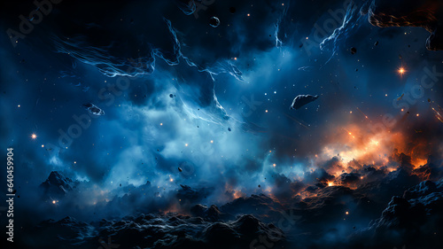 Space scene with stars, planets and asteroids in the galaxy. Panorama. Universe filled with stars, planets, asteroids, nebula and galaxy. Cosmic dust and fog. Generative AI technology.