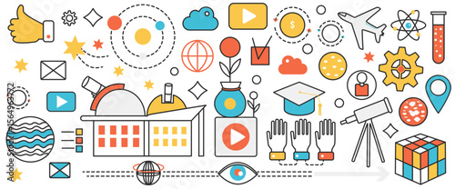Space science research technology. Abstract scientific discovery of cosmos, modern telescope and observatory equipment, astronomy on phone screen, infographic concept banner, thin line art design