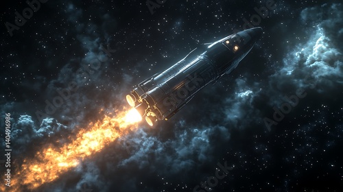Space Shuttle Launching into Starry Sky, A space shuttle launching into space with fiery exhaust against a starry background
