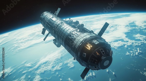 Space station orbiting Earth, showcasing advanced technology against a backdrop of clouds