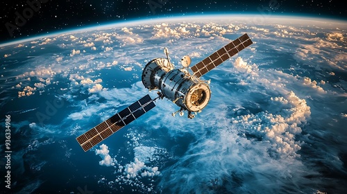 Spacecraft orbiting Earth with clouds and stars, blending the wonder of space exploration with the beauty of our planet as seen from above.