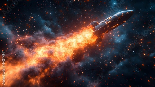 Spacecraft soars through cosmos trailing fiery plumes amid glowing nebula clouds and scattered stardust