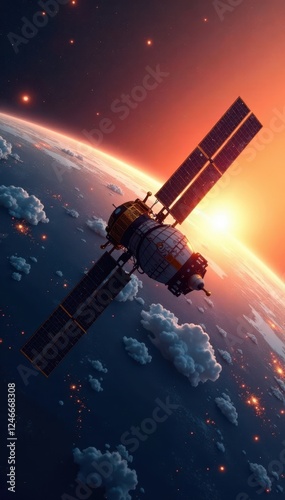 Spacecraft with satellite in orbit around the Earth at sunset, astronomical phenomena, satellite