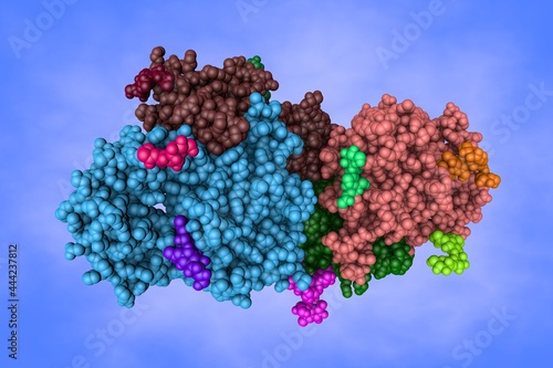 Space-filling molecular model of human prostatic acid phosphatase, biomarker of prostate cancer. Rendering with multi-colored protein chains based on protein data bank. 3d illustration