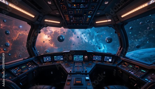 Spaceship Cockpit View Cosmic Nebula Glowing Planets Dark Blue