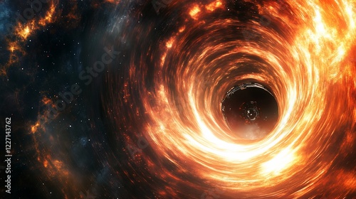 Spaceship entering fiery wormhole, cosmic background, science fiction