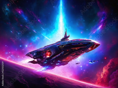 Spaceship exploring vibrant galaxy amidst colorful cosmic phenomena in a distant universe