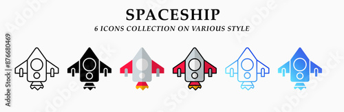 Spaceship icons collection. 6 Various styles. Lineal, solid Black, flat, lineal color and gradient. For sign, symbol, presentation, infographic or web graphics. Vector Illustration.