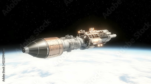 Spaceship orbiting Earth, detailed view of spacecraft design and Earth's curvature.