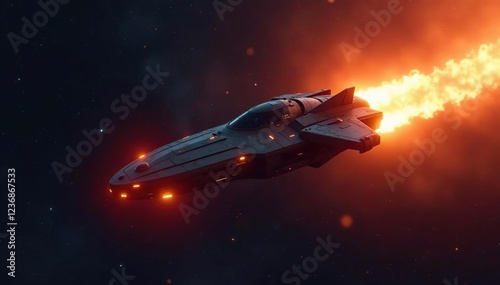 Spaceship with blazing orange lights illuminating the dark of space, starlight, flames