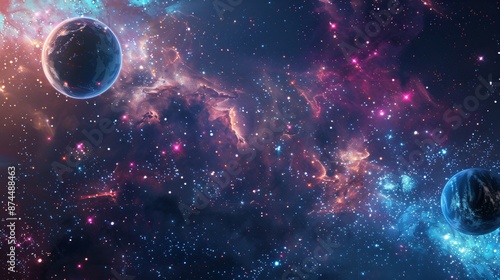 Space-themed backdrop featuring stars, planets, and a glowing galaxy