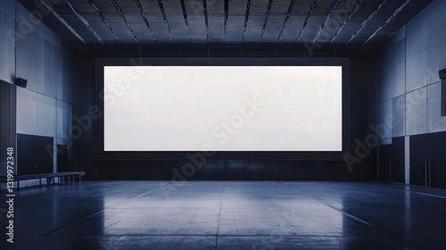 Spacious Indoor Venue with Large Blank Screen on Wall, Minimalist Design, Modern Architecture, Perfect for Presentations, Workshops, or Film Screenings in Contemporary Style