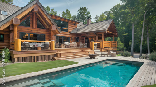 Spacious log cabin home with a pool and lush greenery, perfect for outdoor relaxation and summer gatherings.