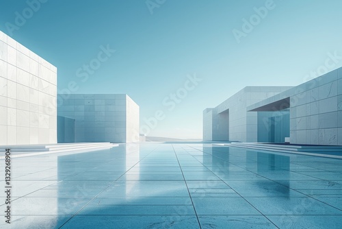 Spacious plaza with clean, modern buildings, illuminated by soft natural light