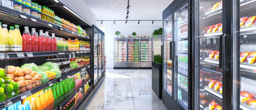 Spacious supermarket aisle with neatly arranged shelves offering an array of fresh produce, colorful beverages, and various food items under bright lighting.