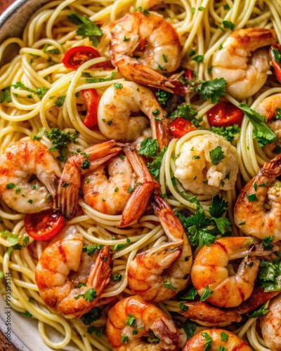Spaghetti pasta topped with shrimp and fresh herbs.