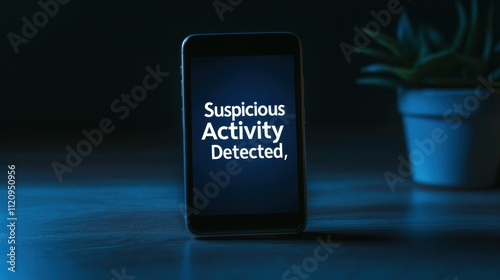 Spam call and scam technology, A dark scene featuring a smartphone displaying the message "Suspicious Activity Detected" with a plant in the background.