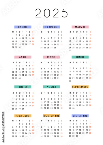 Spanish calendar 2025 year. Vector stationery calendar week starts Monday. Yearly organizer. Simple modern calendar template in minimalist design. Business illustration.