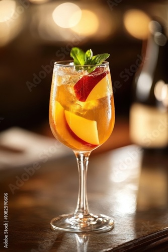 Sparkling Apple Sangria Refreshing peach sangria with mint garnish in elegant glass on rustic table