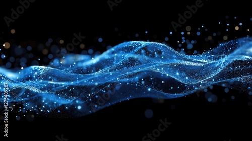 Sparkling blue waves flow through the background in an abstract design, creating a sense of movement and dynamism with elegant, fluid motion