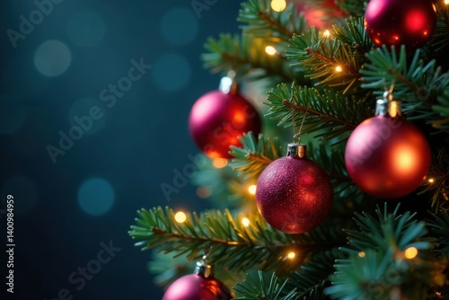 Sparkling Christmas tree with colorful baubles surrounded by twinkling lights, lights, decorations