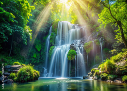 Sparkling droplets cascade down a refreshing waterfall, surrounded by lush greenery and misty atmosphere, evoking feelings of serenity and rejuvenation on a warm summer day.