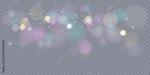 Sparkling glare light effects with colorful shimmer. Beautiful lens flare effect with bokeh, glittery particles and rays. Shining abstract background. Vector illustration