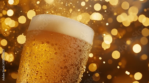 Sparkling Golden Beer in Festive Lights - Cold beer, golden bokeh, celebration, refreshment, bubbles. Perfect for pubs, breweries, and festive occasions.