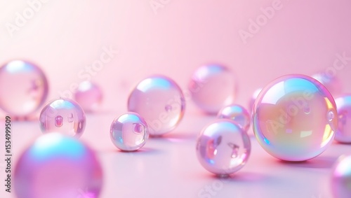 Sparkling Pink Bubbles Abstract Background Pastel iridescent spheres float on a soft pink surface creating a dreamy aesthetic perfect for design projects.