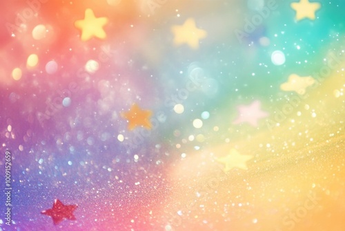 Sparkling rainbow colored festive glitter background with star shapes and bokeh lights