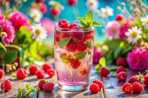 Sparkling Raspberry Lemonade with Flowers & Mint: Vibrant Summer Drink Stock Photo