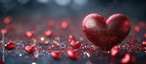 Sparkling red heart with many small red hearts on dark background, romantic atmosphere, valentine's day concept, festive mood