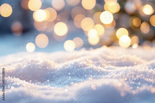 Sparkling snowflakes in soft-focus foreground with warm glowing bokeh lights in the blurred background. Winter, festive holiday concept. Ai generative