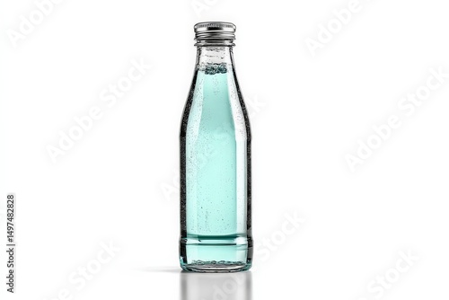 Sparkling water bottle with bubbles displayed on a clean surface