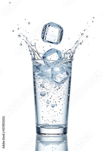 Sparkling water splash with ice cubes in glass refreshing drink pure water crystal clear cold