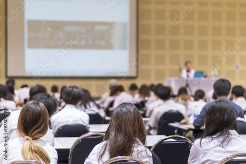 Speaker giving educational seminar, school lecture, or entrepreneurship business talk blur background in conference meeting with audiences or students in back of the room