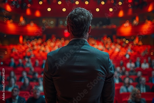 Speaker on stage at a seminar with audience and spotlight effects