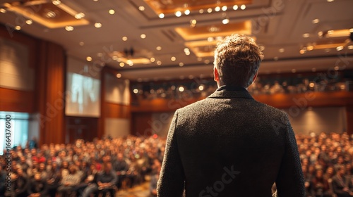 Speaker on stage viewed from behind wearing dark jacket, addressing large blurred audience in conference hall. Warm lighting, wooden panels, and presentation screen create professional atmosphere