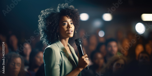 Speaker Woman Performing on Stage and Speaking to Large Audience, Event Professional.