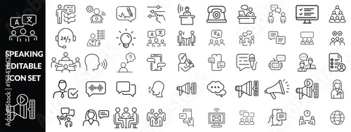 Speaking line editable icon set. Speaking icon set. Communication related icons: speech, talk, discussion, speech bubble, team, meeting, people, business and more